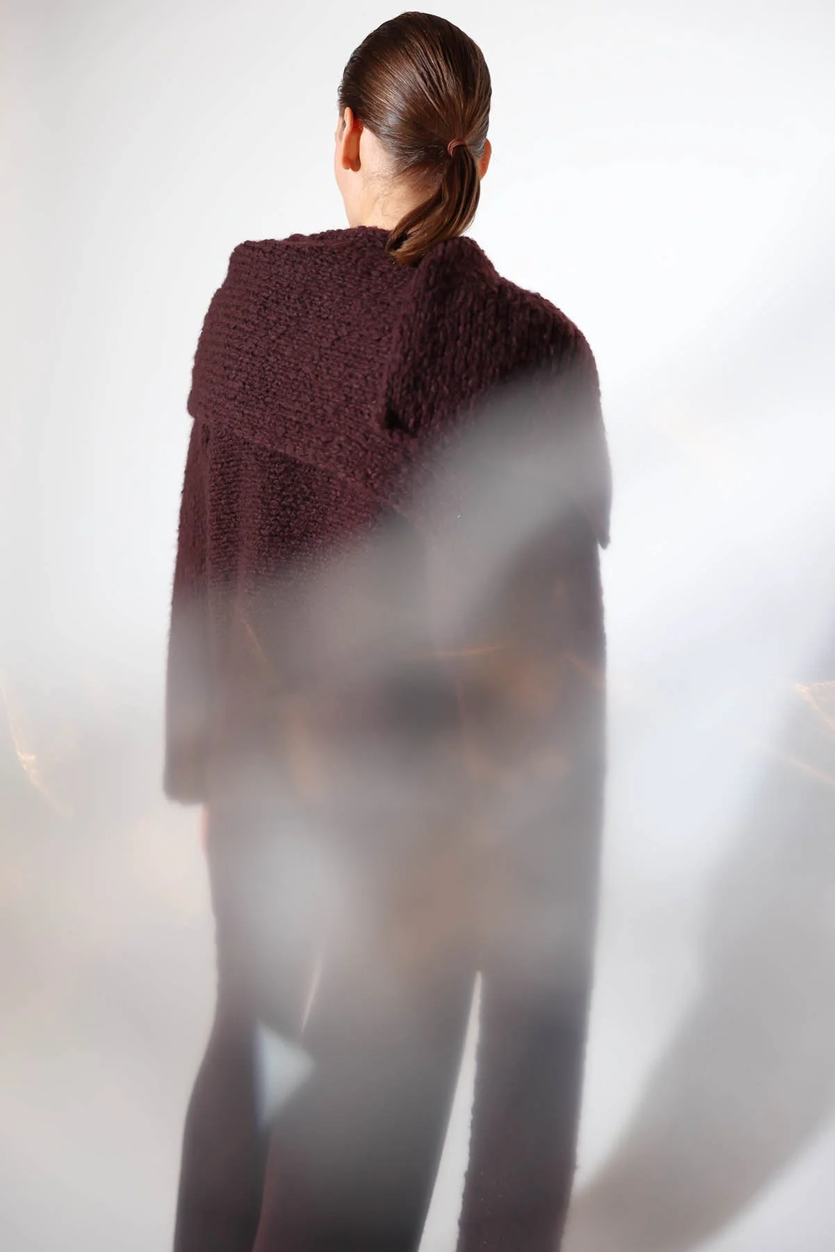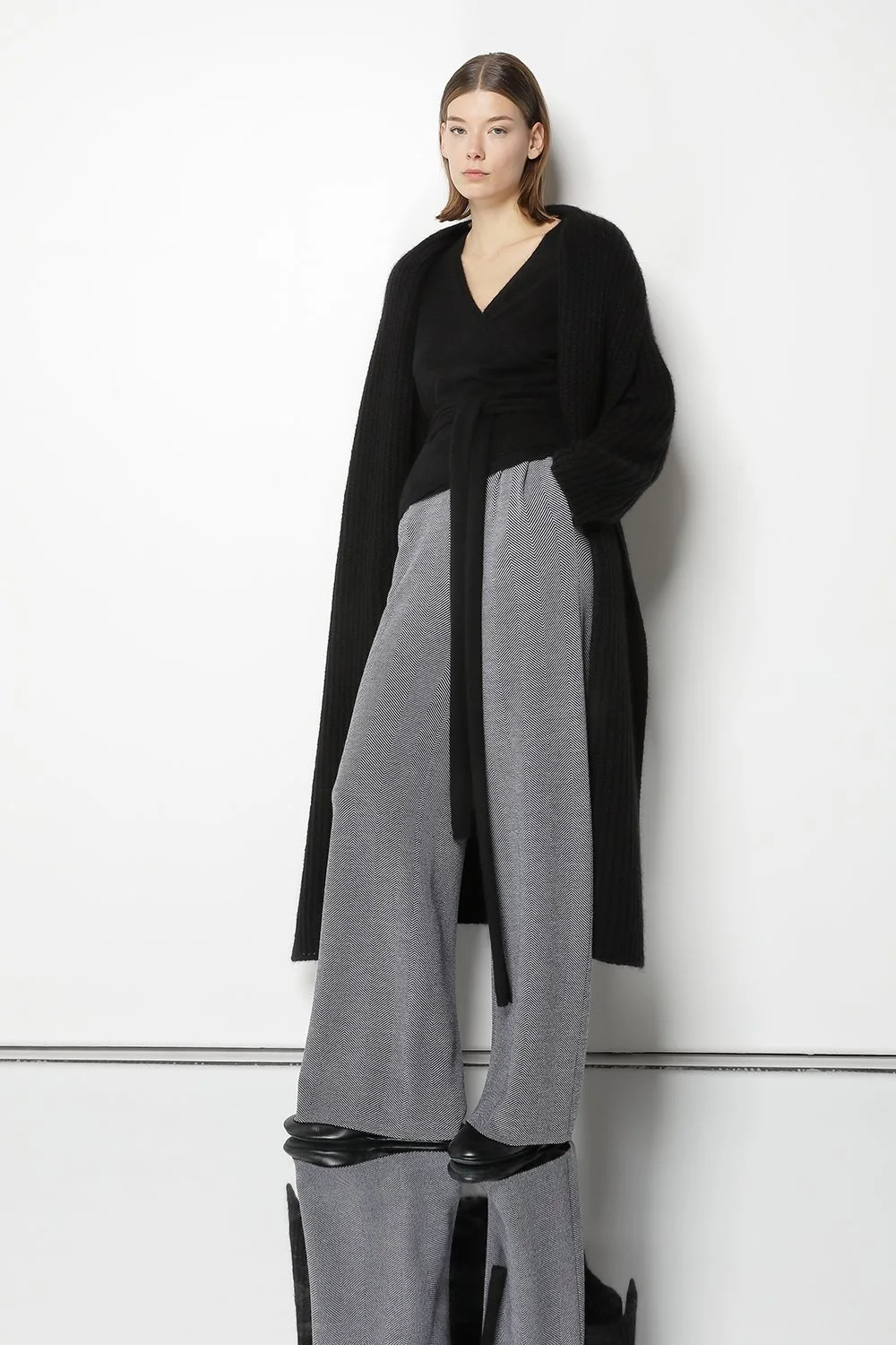 BRUSHED CASHMERE SILK IN COL. BLACK + LUNA fluffy ribbed coat + fluffy cache coer + herringbone pleated palazzo pants