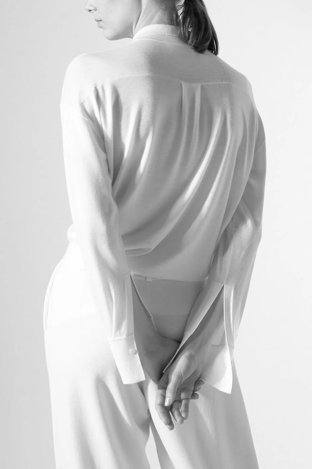 MERINO CASHMERE IN COL. LUNA seamless crewneck jumper + midi scarf + seamless beanie + seamless mittens + milano cropped pants