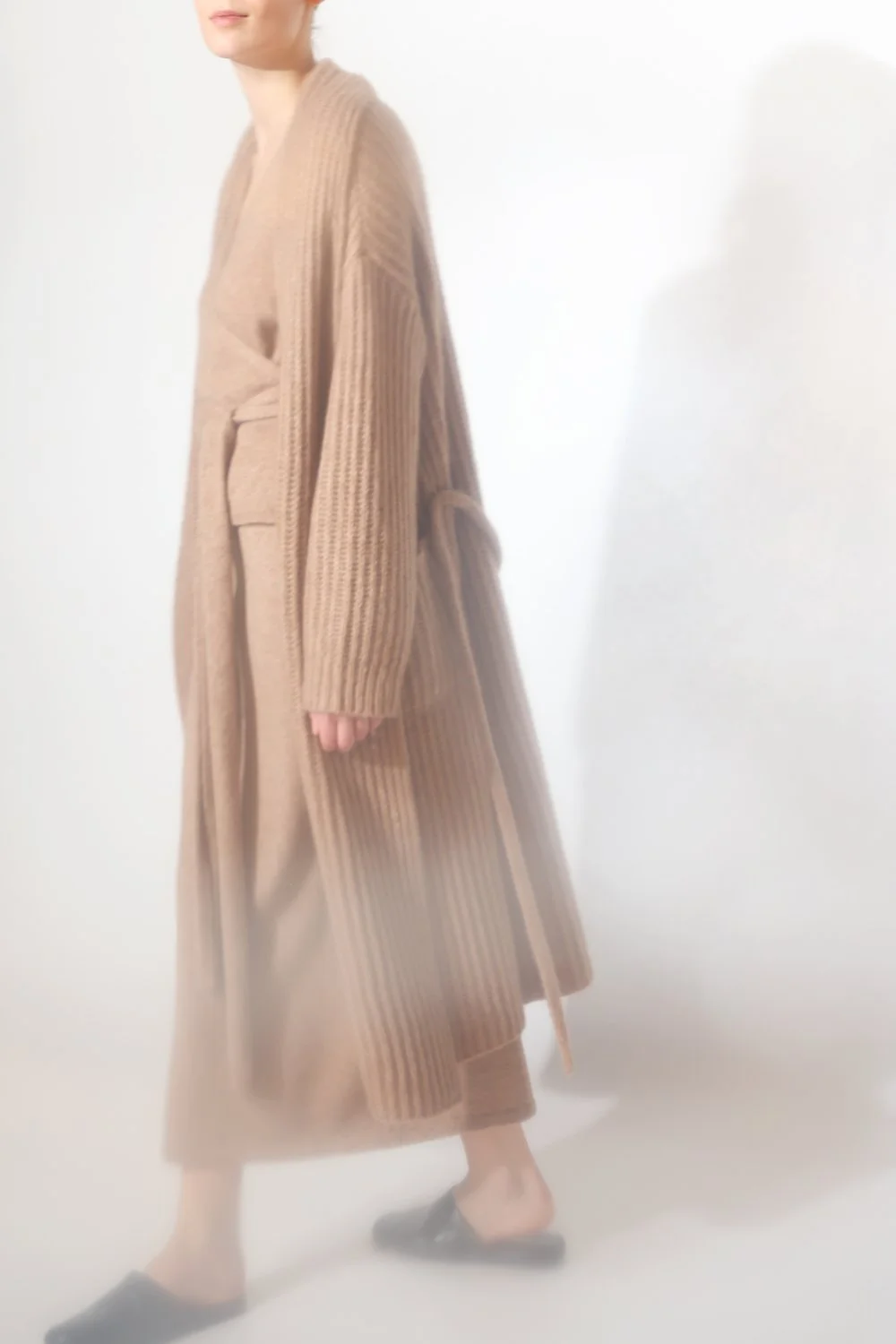 BRUSHED CASHMERE SILK IN COL. HAY fluffy ribbed coat + fluffy cache coer + fluffy maxi A skirt