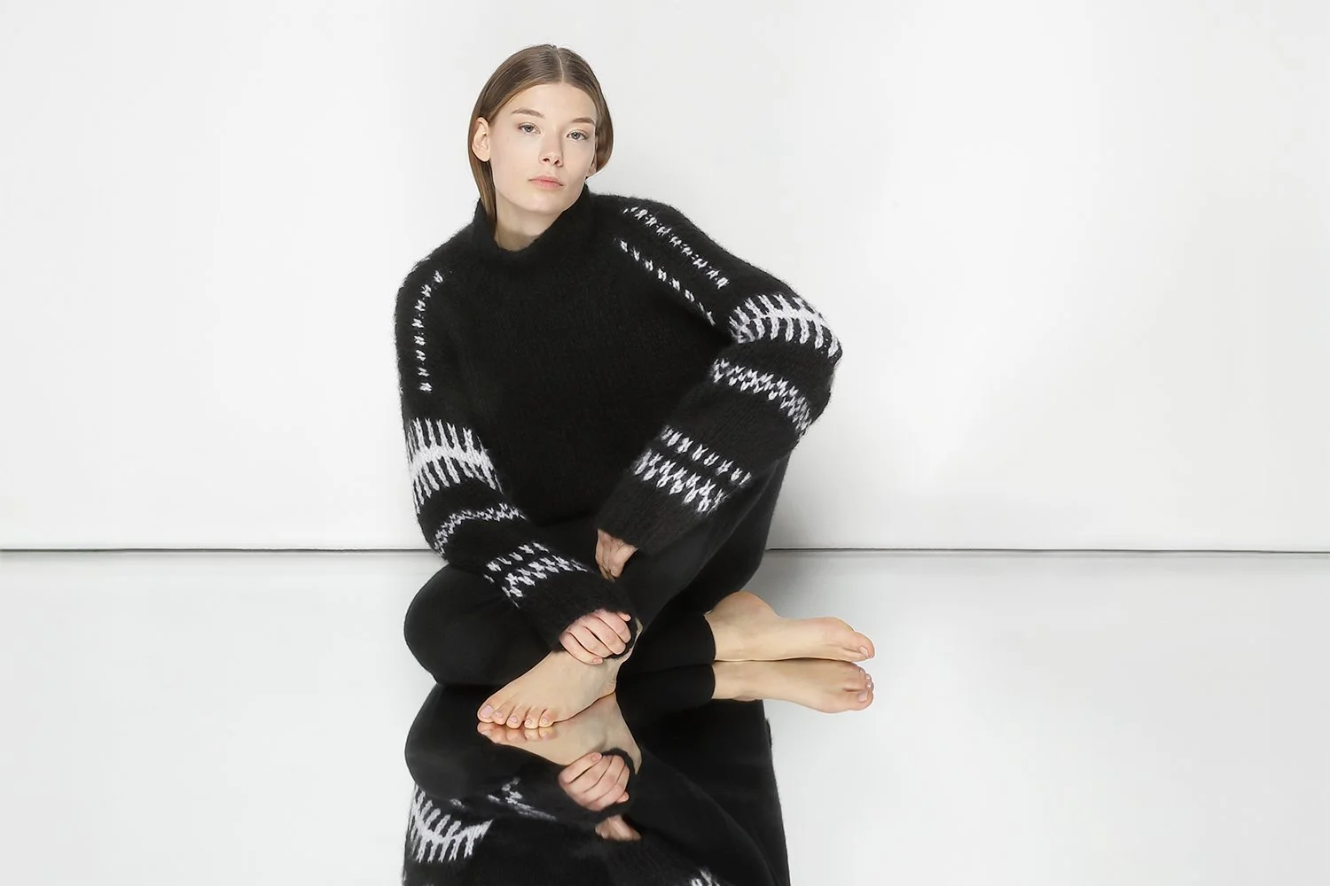 MERINO CASHMERE + EXTRAFINE MERINOWOOL IN COL. LUNA + BLACK seamless crewneck jumper + midi scarf + seamless beanie + seamless mittens + milano cropped pants