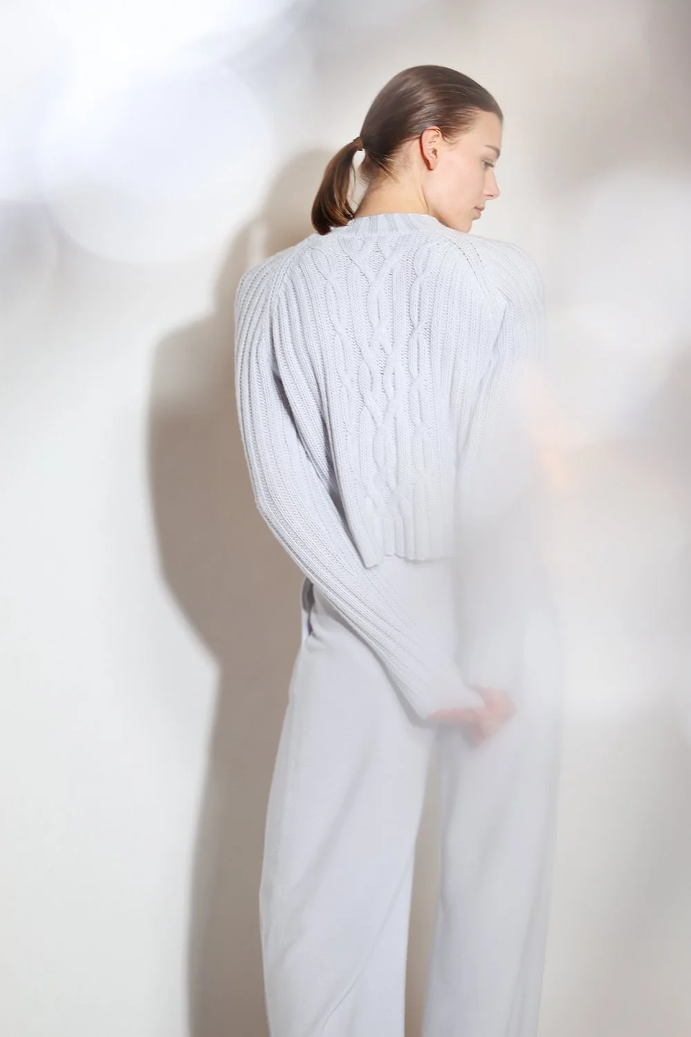 CASHMERE COTTON IN COL. ICE chilly cropped cable crew jumper + chilly pleated palazzo pants