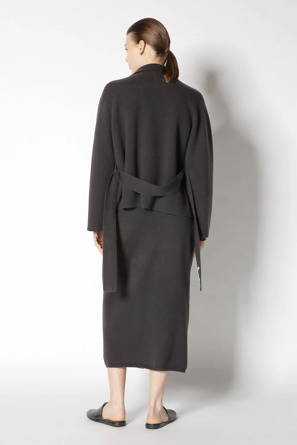CASHMERE COTTON IN COL. COAL doubleface belted cropped jacket + chilly maxi wrap skirt