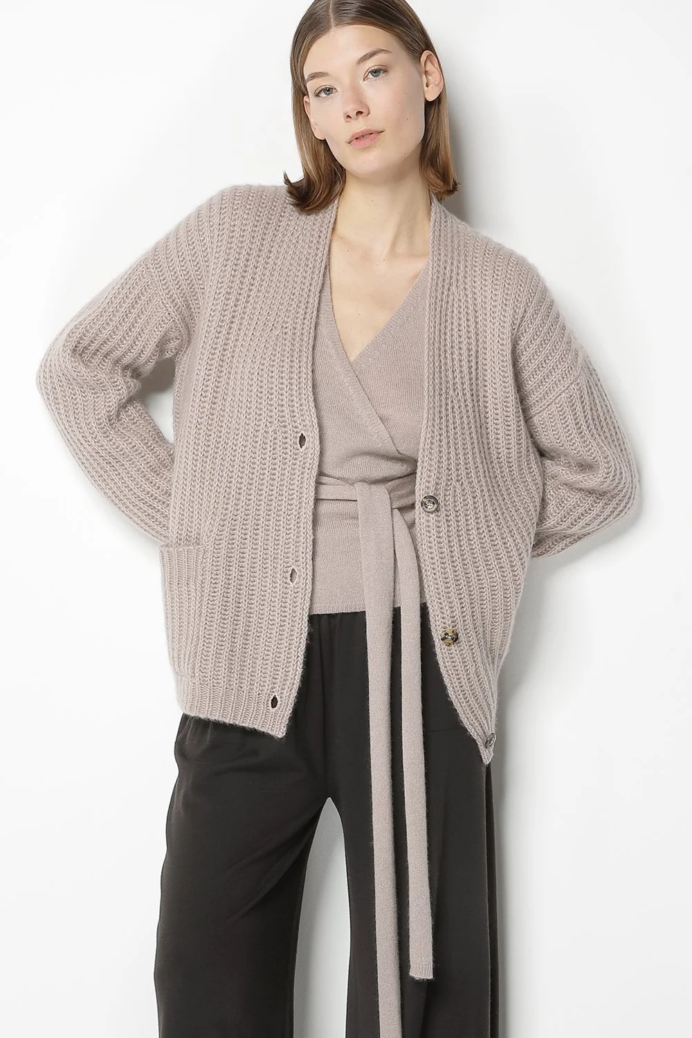 BRUSHED CASHMERE SILK IN COL. WILLOW + EXTRAFINE MERINOWOOL IN COL. BLACK fluffy ribbed cardigan + fluffy cache coer + extrafine palazzo pants